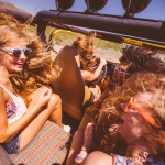Four friends driving in an open top car, rear passenger POV