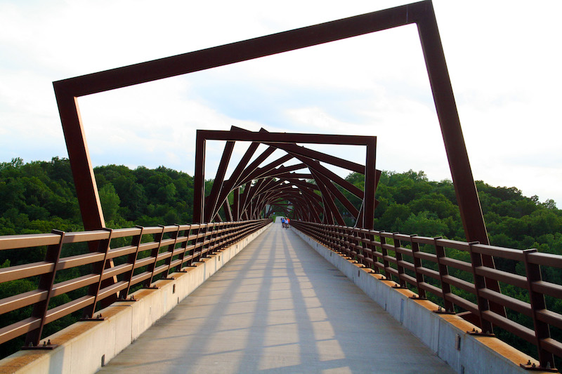 Based along the High Trestle Trail, which spans 25 miles through five towns in four central Iowa counties, this bridge is worth an easygoing pace. About three miles west of Madrid, its design describes the area’s past via six overlooks paired with interpretative storytelling panels. Overhead, 41 steel “frames” represent the support cribs found within a traditional coal mine. At night, blue lights illuminate the section marking the main river channel below.
